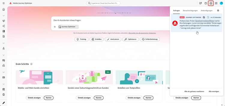 Wenn die genehmigenden Personen Änderungen beantragen, werden Sie durch eine E-Mail und eine Journey Optimizer-Benachrichtigung benachrichtigt, die Sie durch Klicken auf das Glockensymbol oben rechts im Bildschirm auf der Registerkarte Anfragen aufrufen können.