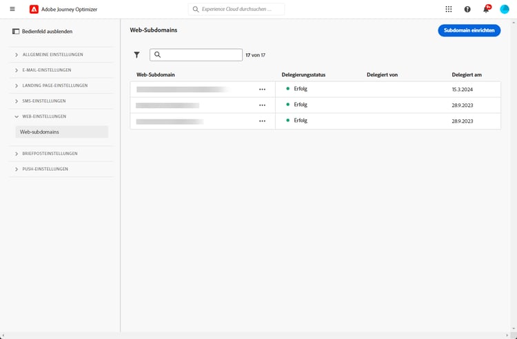 Standardmäßig können Sie mit Journey Optimizer insgesamt bis zu 10 Subdomains delegieren (die sowohl E-Mail- als auch Web-Kanäle abdecken). Abhängig von Ihrem Lizenzvertrag können Sie jedoch bis zu 100 Subdomains delegieren. Wenden Sie sich an Ihre Adobe-Kontaktperson, um die Anzahl der Subdomains zu erfahren, für die Sie berechtigt sind.