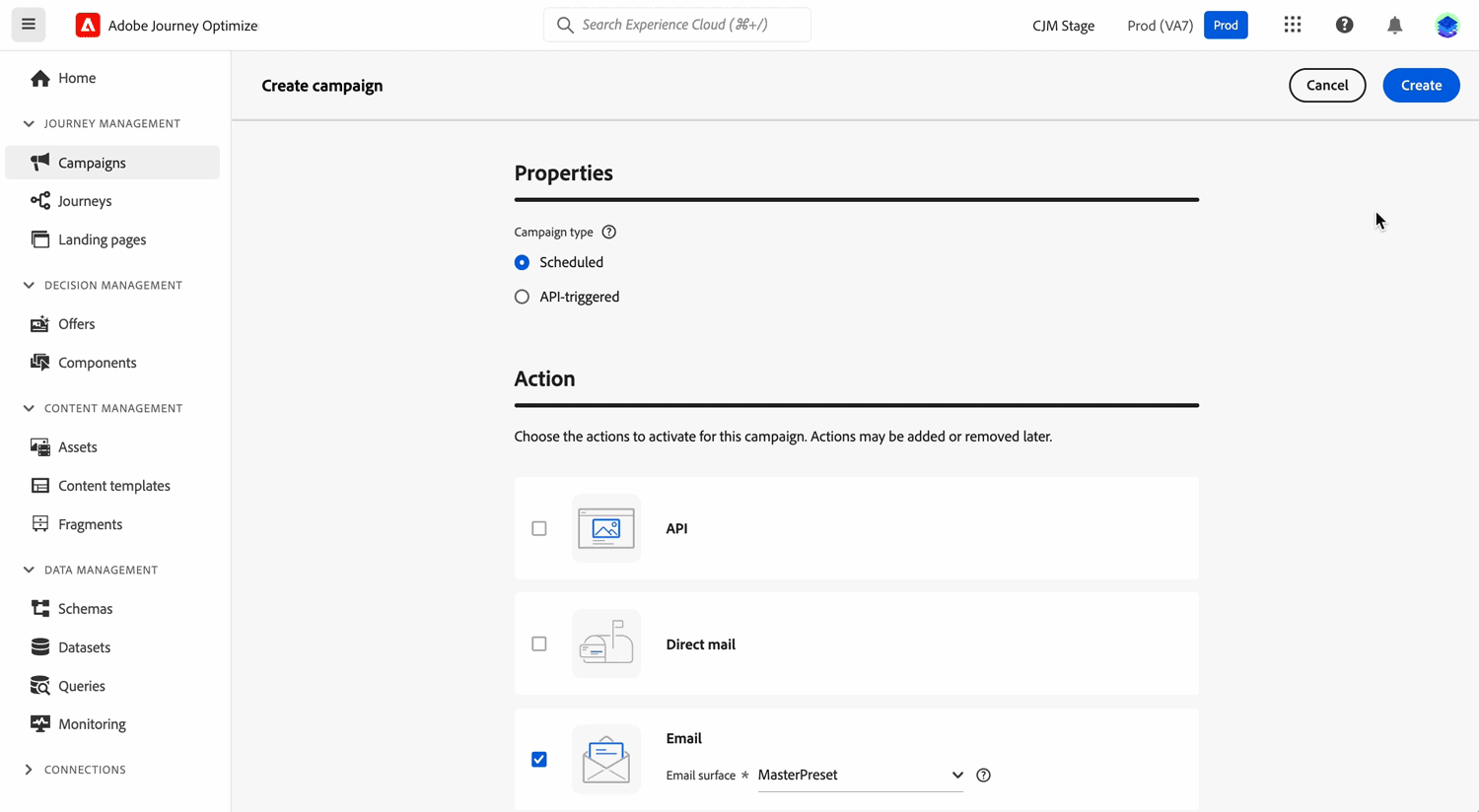 - Beim Hinzufügen einer E-Mail-, SMS- oder Push-Aktion zu einer Journey ist die Oberfläche in der aktuellen Journey jetzt standardmäßig mit der zuletzt verwendeten Oberfläche für diesen Kanal vorausgefüllt.