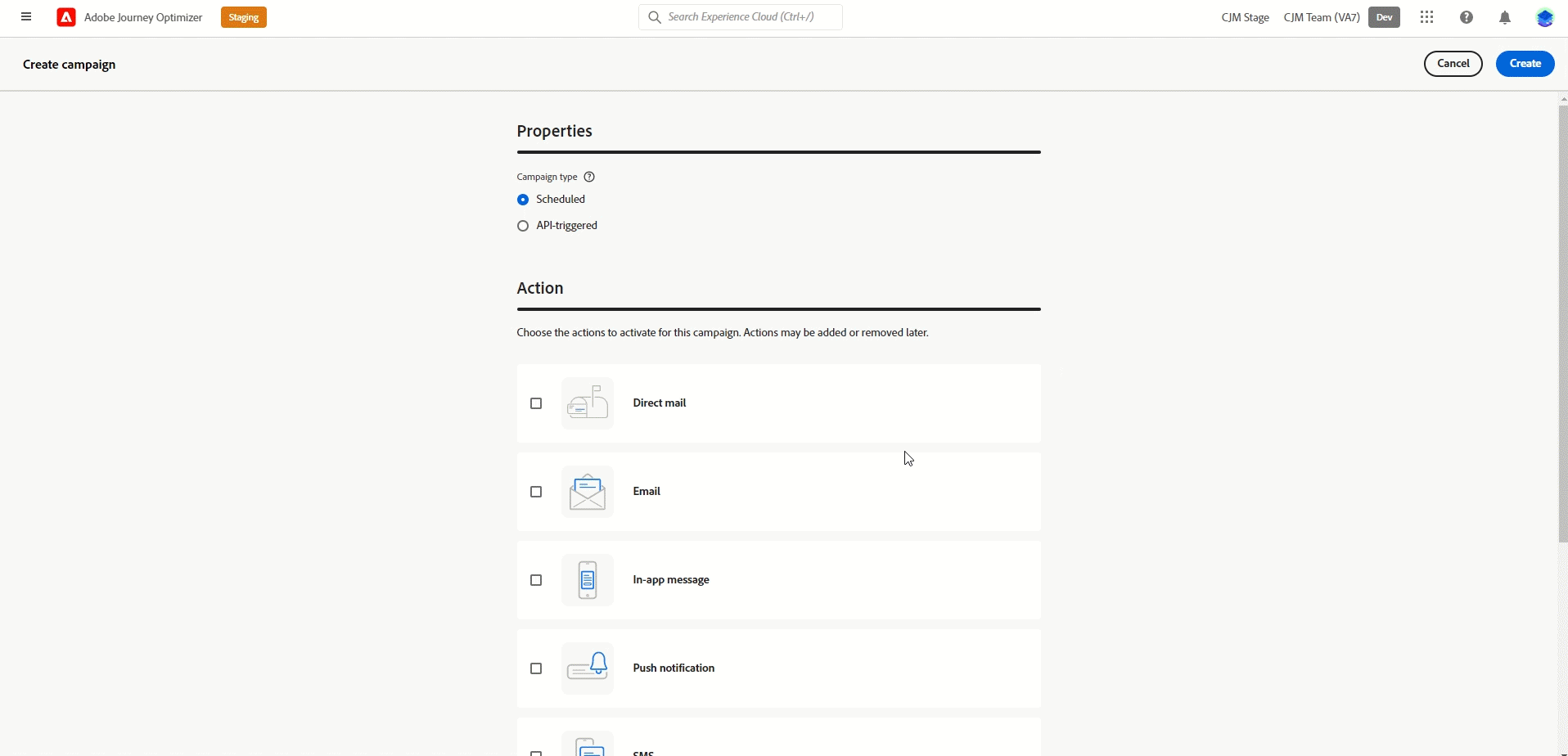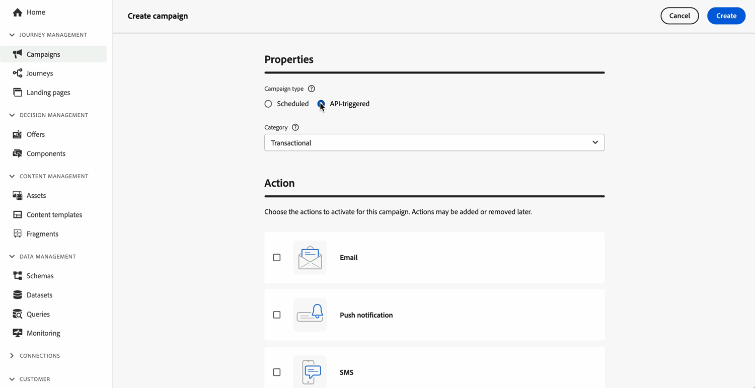 Bis zu dieser Version bediente die Funktion für API-ausgelöste Kampagnen den Bedarf an verschiedenen operativen und transaktionalen Nachrichten, wie etwa Zurücksetzen des Passworts oder OTP-Token, sie konnte jedoch nicht zur Erstellung von Marketing-Kampagnen verwendet werden. Für API-ausgelöste Kampagnen stehen die Kanäle E-Mail, SMS und Push-Benachrichtigungen zur Verfügung.