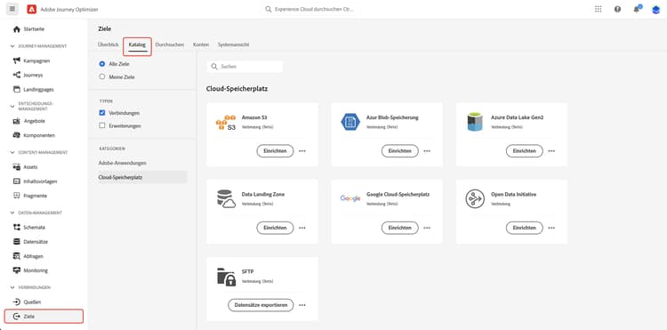Der Export von Journey Optimizer-Datensätzen in Cloud-Speicherziele ist jetzt allgemein verfügbar. Diese Funktion ermöglicht es Ihnen, eine Live-Verbindung mit Zielen im Cloud-Speicher herzustellen, um den Inhalt Ihrer Datensätze zu exportieren.