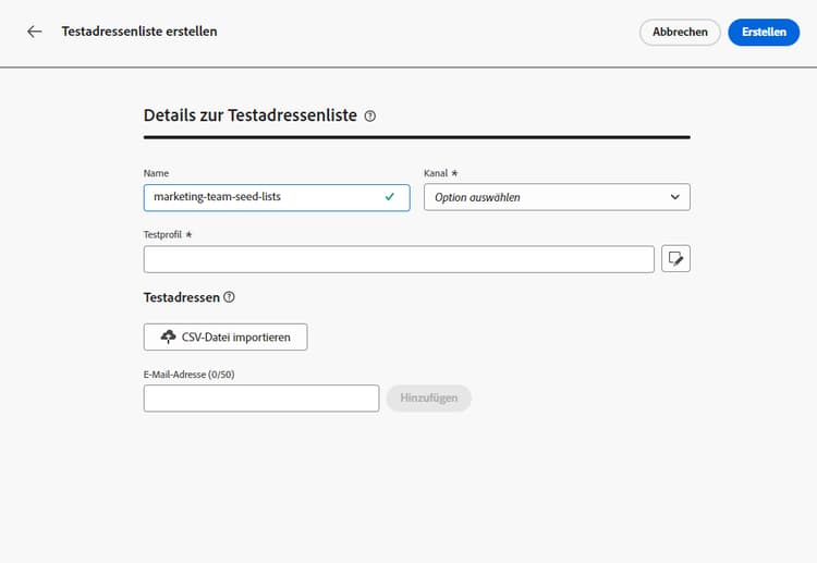 Sie können in Journey Optimizer jetzt Testadressenlisten erstellen und verwalten. Eine Testadressenliste besteht aus internen Adressen, die zu Ihrer eigentlichen Zielgruppe hinzugefügt werden können und zum Zeitpunkt der Versandausführung genau die gleiche Nachricht wie die angesprochenen Profile erhalten. Mit dieser Funktion können Sie die gesendeten Kommunikationen überwachen und sicherstellen, dass alle Anzeigeformate, URLs, Bilder und Links korrekt sind.