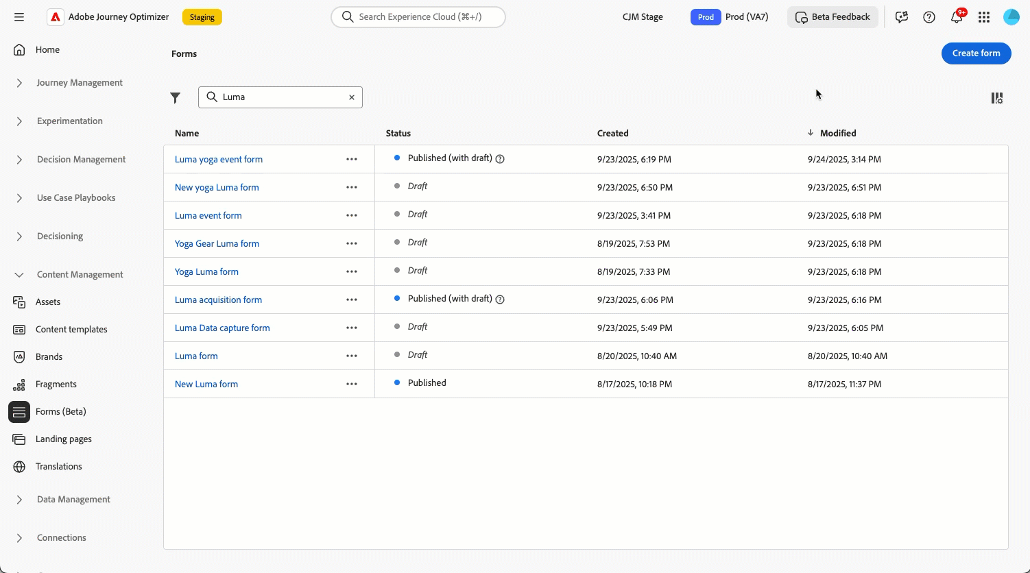 Erstellen, entwerfen und verwalten Sie benutzerdefinierte Formulare, die auf Ihre Anforderungen zugeschnitten sind und auf einem bestimmten Datensatz basieren. Sie können diese Formulare dann in Landingpages nutzen, um die Profilattribute Ihrer Wahl zu dem für jedes Formular definierten Datensatz hinzuzufügen.