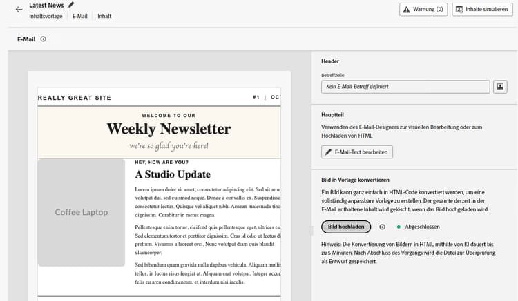 Der Bild-zu-HTML-Converter ist eine KI-gestützte Funktion, die statische Bildentwürfe in vollständig anpassbare, modulare HTML-E-Mail-Inhaltsvorlagen konvertiert. Dieses Code-freie Tool ermöglicht es Marketing-Experten, visuelle Designs in responsive, bearbeitbare E-Mail-Vorlagen umzuwandeln, ohne dass technisches Know-how erforderlich ist. Es eignet sich perfekt für die Plattformmigration, die schnelle Erstellung von Vorlagen und die Erstellung wiederverwendbarer Vorlagenbibliotheken.