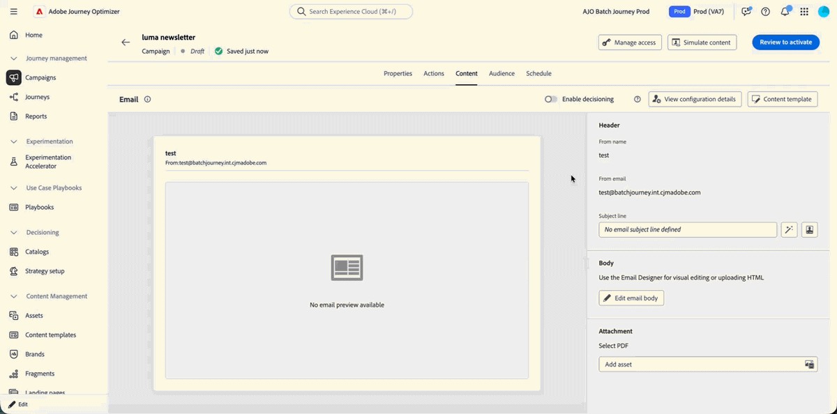 Sie können jetzt Decisioning verwenden, um den Inhalt Ihrer E-Mail-Nachrichten zu personalisieren und zu optimieren. Nutzen Sie Prioritätswerte, Formeln oder KI-Modelle, um jedem Empfänger die relevantesten Angebote und Inhalte anzuzeigen.