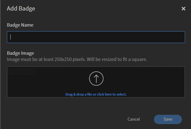 Geben Sie den Abzeichennamen ein. Laden Sie das Abzeichen hoch, indem Sie auf Abzeichen hochladen klicken und auf Speichern klicken.