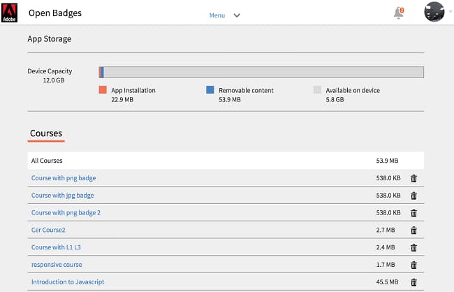 Anhand der Informationen zum App-Speicher können Sie den gesamten Speicher des Geräts, der App und der heruntergeladenen Kurse überprüfen. Mit diesen Informationen können Sie Kurse entsprechend herunterladen. Um heruntergeladene Kurse vom Gerät zu löschen, tippen Sie neben dem entsprechenden Kursnamen auf das X-Symbol.