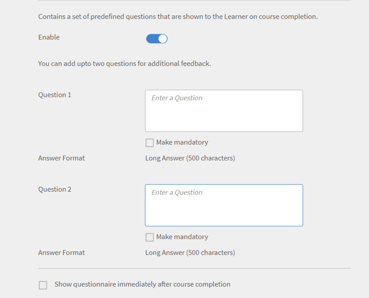 Wählen Sie Fragebogen sofort nach Kursabschluss anzeigen aus, wenn Teilnehmer den Feedback-Fragebogen unmittelbar nach Abschluss des Kurses anzeigen möchten.