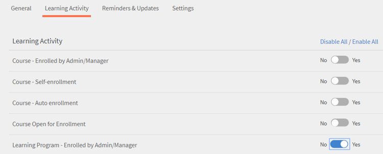 - E-Mail-Vorlagen, die mit einem Lernobjekt oder einer Aktivität verknüpft sind: Diese E-Mails werden an Teilnehmer, Autoren oder Manager gesendet, wenn eine Lernaktivität vorhanden ist. Beispielsweise E-Mails, die nach der Kursregistrierung, der Teilnahme am Klassenzimmer, dem Kursabschluss usw. ausgelöst werden.