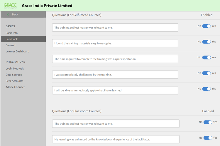 Im vorherigen Verfahren wurden die Schritte zur Konfiguration der Feedbackeinstellungen auf globaler Ebene beschrieben. Das heißt, die Einstellungen werden auf alle Kurse angewendet. Zusätzlich zu diesen globalen Fragen können Sie als Administrator oder Autor zusätzliche L1- und L3-Feedbackfragen auf Instanzebene konfigurieren.