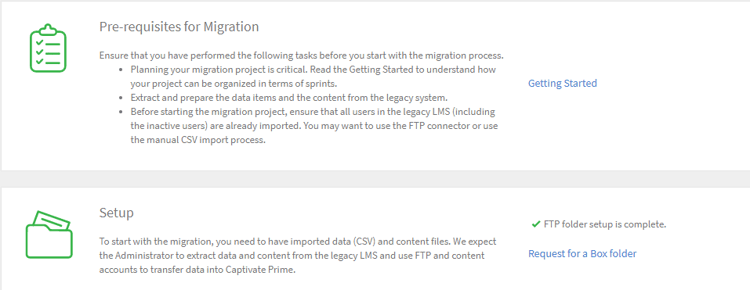 Bevor Sie die eigentliche Migration aller Inhalte planen und starten, müssen Sie zunächst die FTP- und BOX-Ordner einrichten. Sie benötigen diese Ordner, um Ihre CSV-Dateien in diesen Ordnern abzulegen. Sobald Ihre alten Inhalte in Form von CSV-Dateien in den FTP- und BOX-Ordnern verfügbar sind, kann Lern-Manager die Daten nutzen.