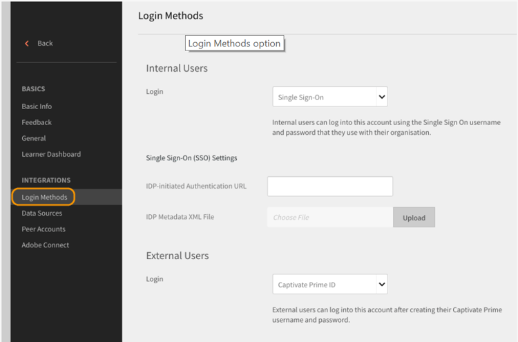 Klicken Sie auf der Lern-Manager-Startseite auf **** Einstellungen > Anmeldemethoden .