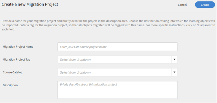 Geben Sie ein Tag für Ihr Projekt, den Kurskatalog und eine Beschreibung für das Migrationsprojekt an. Ihre Migrationsdatenelemente werden mithilfe dieses Migrationsprojekt-Tags identifiziert. Wenn Sie keinen bestimmten Kurskatalog haben, wählen Sie den Standardkatalog aus der Dropdownliste aus. Alle Kurse, die mithilfe eines Migrationsprojekts migriert werden, sind im Katalog enthalten, den Sie in dieser Phase ausgewählt haben. Wenn Sie keinen Katalog auswählen, sind alle migrierten Kurse Teil des Standardkatalogs.