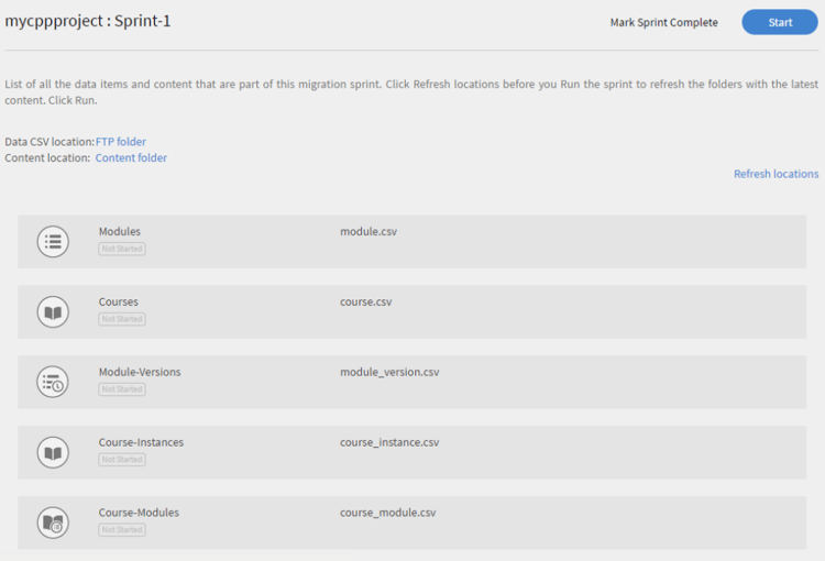 Klicken Sie auf **Start , um die Sprint-Migration mit den hochgeladenen Daten und Inhalten zu starten. Klicken Sie vor dem Starten des Sprint-Laufs auf Aktualisieren **, um die FTP- und Inhaltsordner mit dem Lern-Manager zu synchronisieren.