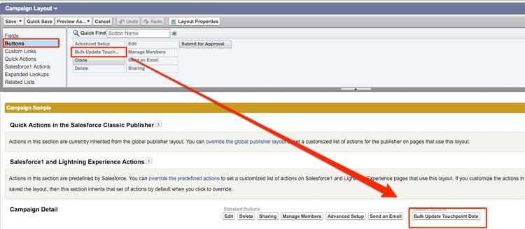 Ziehen Sie die Schaltfläche Massenaktualisierung Touchpoint-Datum in den Abschnitt mit den benutzerdefinierten Schaltflächen.