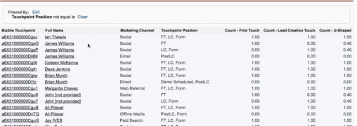 Dieser Bericht zeigt jedoch die Anzahl der Touchpoints im Zusammenhang mit James an. Innerhalb des Berichts können Sie sehen, dass James einen individuellen FT (First Touch), einen individuellen LC, ein Formular (Lead Creation Touch) und einen PostLC Touchpoint (eine Formularübermittlung, die nach dem LC Touchpoint erfolgt) hat.