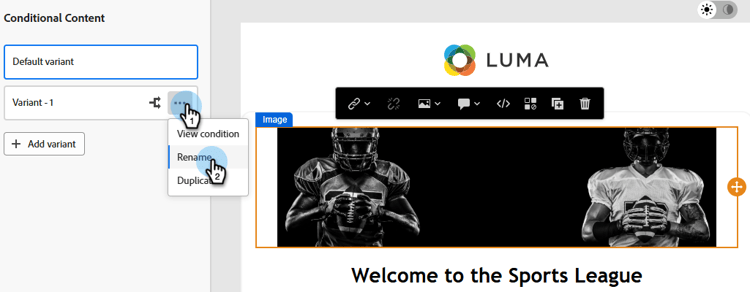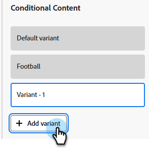 note note NOTE Durch Klicken auf die Auslassungszeichen können Sie auch die definierte Bedingung der Variante anzeigen und sie duplizieren. Wenn Sie über mehr als eine Variante verfügen, wird eine Löschoption verfügbar. Wenn Sie nur eine Variante haben, können Sie sie löschen, indem Sie einfach erneut auf das Symbol Bedingten Inhalt aktivieren klicken (es lautet jetzt Bedingten Inhalt deaktivieren wenn Sie den Mauszeiger darüber bewegen). {width="600" modal="regular"}