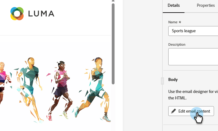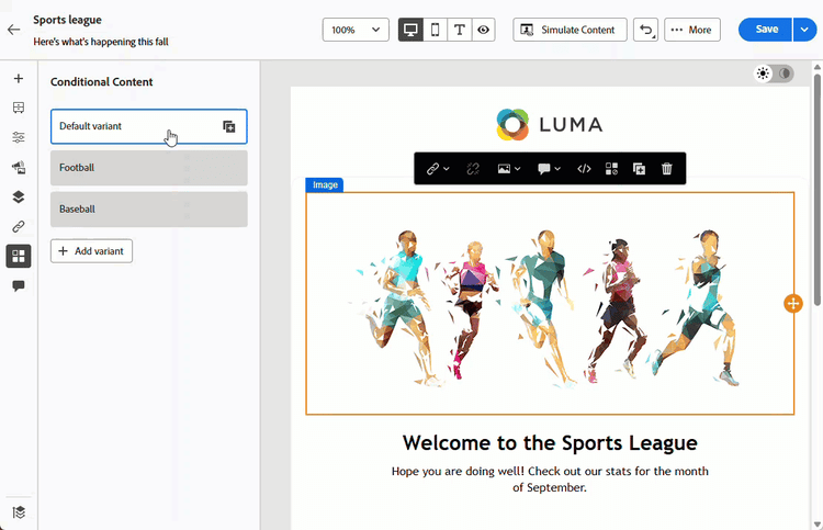 Empfänger sehen Inhalte basierend auf den in den einzelnen Segmenten definierten Regeln. Im obigen Beispiel sieht jeder, der „Football“ auf seinem Marketo Engage-Feld Lieblingssport aufgeführt hat, das Football-Image.