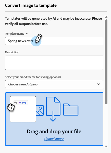 Geben Sie einen Vorlagennamen und optional eine Beschreibung ein. Optional können Sie auch Ihren Markenstil auswählen. Laden Sie das gewünschte Bild hoch oder ziehen Sie es per Drag-and-Drop hinüber.