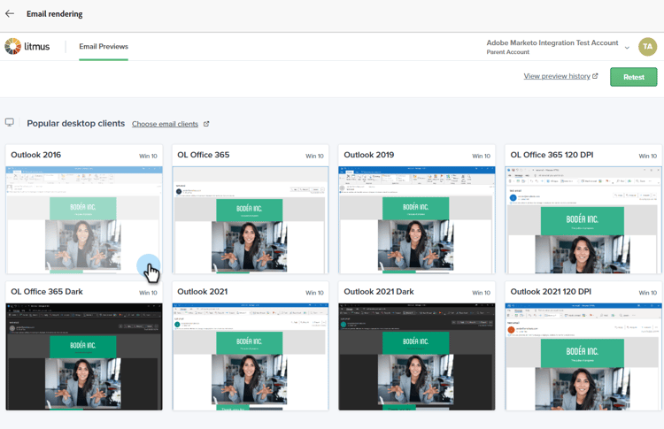 Nutzen Sie Ihr Litmus-Konto in Marketo Engage, um sofort zu sehen, wie Ihre E-Mail in gängigen E-Mail-Clients gerendert wird.