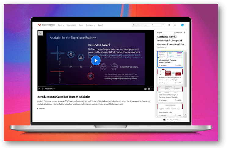 Für visuelle Lerntypen sind Playlists auf Experience League eine besonders nützliche Ressource. Diese fachkundig zusammengestellten Sammlungen von Video-Lerneinheiten helfen Ihnen, schnell die nötigen Fertigkeiten und Kenntnisse zu erwerben.