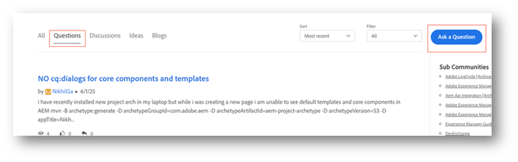 Wenn Sie beispielsweise eine Frage zu AEM Assets haben, stellen Sie sie im Abschnitt Adobe Experience Manager Assets > Fragen ein und nicht einfach in der allgemeinen Adobe Experience Manager-Community. Dadurch erhalten Sie schnellere und präzisere Antworten von Expertinnen und Experten in diesem Bereich.