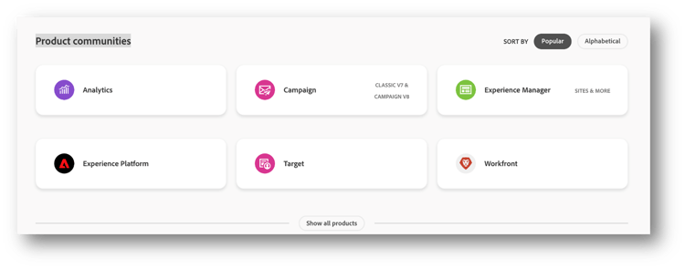 Ob Sie mit Analytics-Dashboards arbeiten, Experimente in Target durchführen oder AEM-Komponenten erkunden: Es gibt einen speziell auf Ihre Interessen und Bedürfnisse zugeschnittenen Bereich. Jeder Produktbereich verfügt über eine eigene Community – mit untergeordneten Communities zu bestimmten Funktionen oder Eigenschaften –, sodass Sie immer den richtigen Ort finden, um sich zu vernetzen und in Foren zu beteiligen.