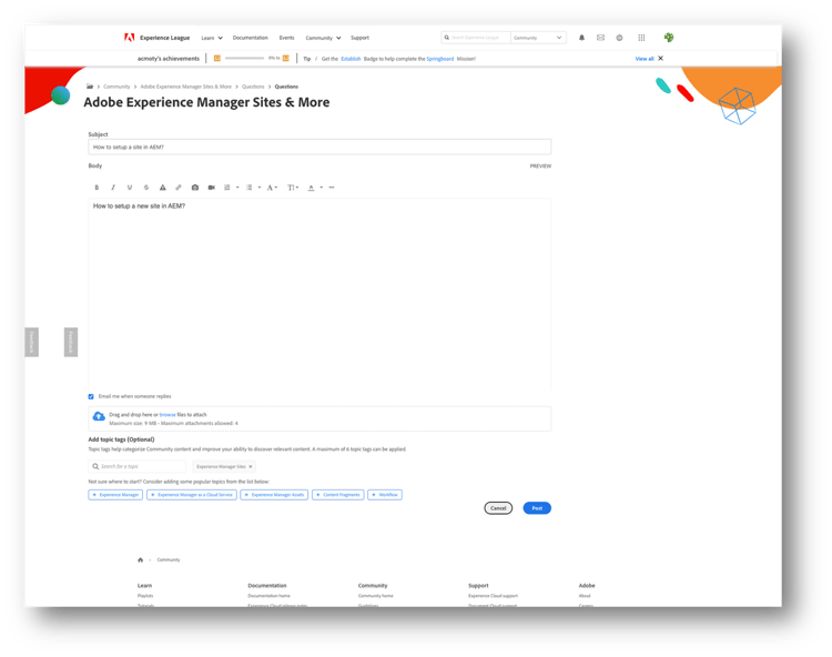 Der Besuch der Community wurde schnell zu einem Teil meines täglichen Arbeitsablaufs – nicht nur, um Antworten zu finden, sondern auch, um Anwendungsfälle aus der Praxis zu untersuchen und nützliche Tipps zu AEM zu entdecken. Schon bald begann ich damit, auf Fragen zu antworten und Erkenntnisse auszutauschen. Jetzt schaue ich jeden Tag auf der AEM-Frageseite vorbei, lese Beiträge, helfe, wo ich kann, und folge Diskussionen, um von anderen zu lernen.