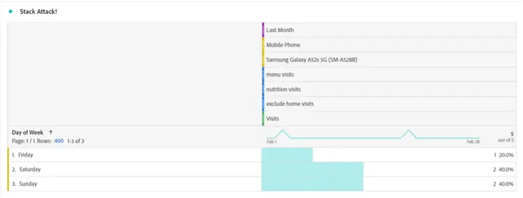 Auf ähnliche Weise können Sie die sich überschneidenden Daten eines Venn-Diagramms erstellen, indem Sie einfach beliebige Segmente stapeln. Die Anzahl der Segmente oder Dimensionen, die Sie stapeln können, ist unbegrenzt. Wenn ich z. B. schnell herausfinden möchte, an welchen Wochentagen im letzten Monat meine Website von einem Mobiltelefon, insbesondere einem Samsung Galaxy A52s, besucht wurde, das zwar mein Menü und meine Ernährungsseiten, aber NICHT meine Startseite aufgerufen hat, kann ich das schnell und spontan so erstellen: