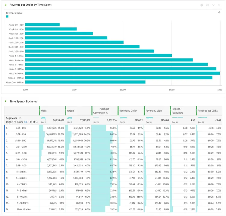 Sie können sogar untersuchen, wie sich Ihre Key Performance Indicators (KPIs) entsprechend der Verweildauer einer Person, der Anzahl der Seiten, die während eines Besuchs aufgerufen werden, der Anzahl der Besuche in der Vergangenheit oder einem anderen numerischen Wert verändern. Im Prinzip können Sie dadurch eine Metrik als Faktor einer anderen Metrik betrachten: