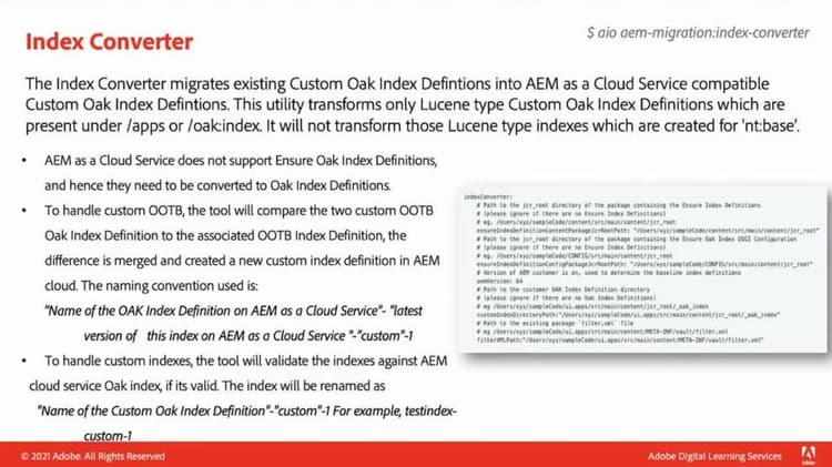 Erfahren Sie, wie der Index Converter automatisch vorhandene AEM-Indexdefinitionen konvertiert, damit sie mit AEM as a Cloud Service kompatibel sind.