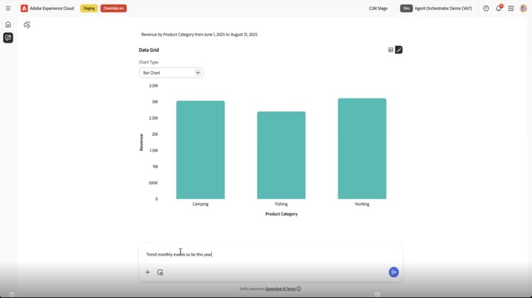 Es wandelt Abfragen in natürlicher Sprache in Visualisierungen und Freiformtabellen um. Dieser Agent greift auf Ereignis-, Profil-, Journey- und Offline-Daten zu, vereinfacht die Erkennung und ermöglicht sofort personalisierte Dashboards, sodass lange Wartezeiten für den Support durch Analysten entfallen.