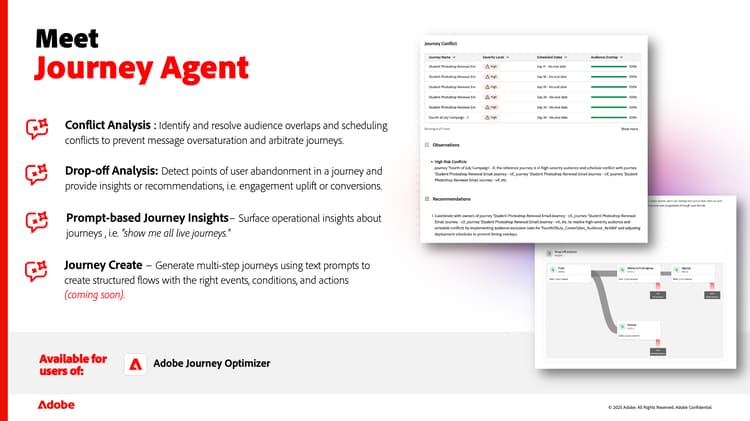 Journey Agent bietet KI-gestützte, kollaborative und skalierbare Orchestrierung von Kunden-Journey in Adobe Journey Optimizer. Marketing-Experten, Analysten und Entwickler können damit Journey schnell und intelligent entwerfen, analysieren und optimieren - sowohl für B2C- als auch für B2B-Versionen.