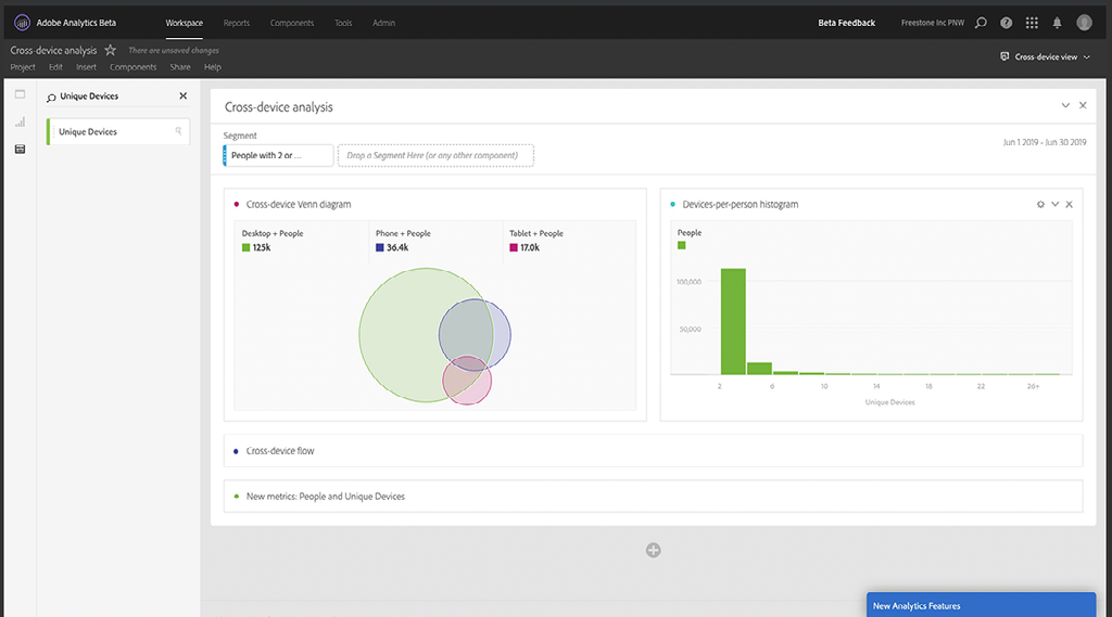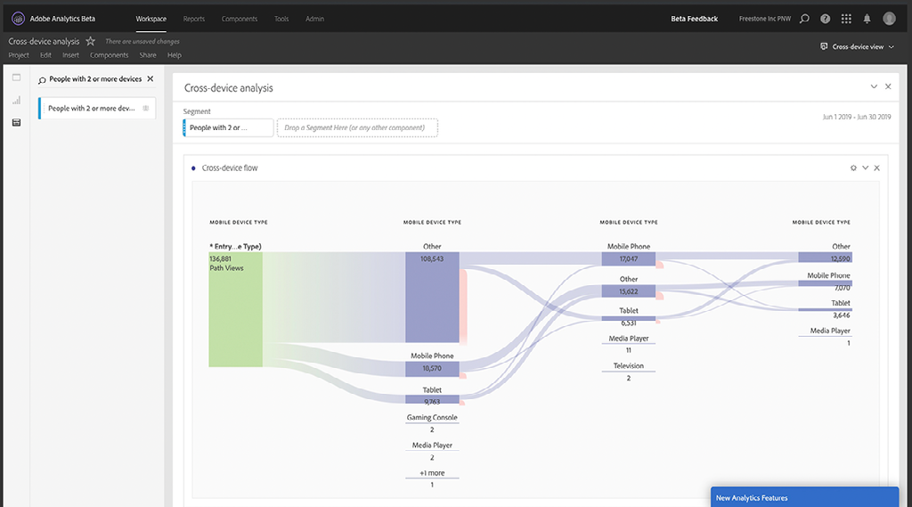 Journey IQ: Cross-Device Analytics (CDA) s’intègre à Adobe Experience Platform Identity Service, en utilisant le Co-op Graph ou le Private Graph pour identifier la manière dont les périphériques sont associés aux personnes. Il tire ensuite parti de ces renseignements pour créer une vue du comportement de l’utilisateur sur l’ensemble des appareils. Analytics sur l’ensemble des appareils dispose de fonctionnalités et d’outils inégalés pour aider votre entreprise à comprendre l’utilisation de plusieurs appareils et l’expérience client sur ces appareils dans leurs interactions avec votre marque. Il se trouve sous Analysis Workspace sous la forme d’une couche qui permet d’obtenir des informations détaillées sur l’analyse de l’audience basée sur la personne et l’attribution, la segmentation et l’analyse de parcours sur plusieurs appareils à l’aide d’outils puissants tels que Abandon, Flow, Cohort, Segment IQ et Attribution IQ.
