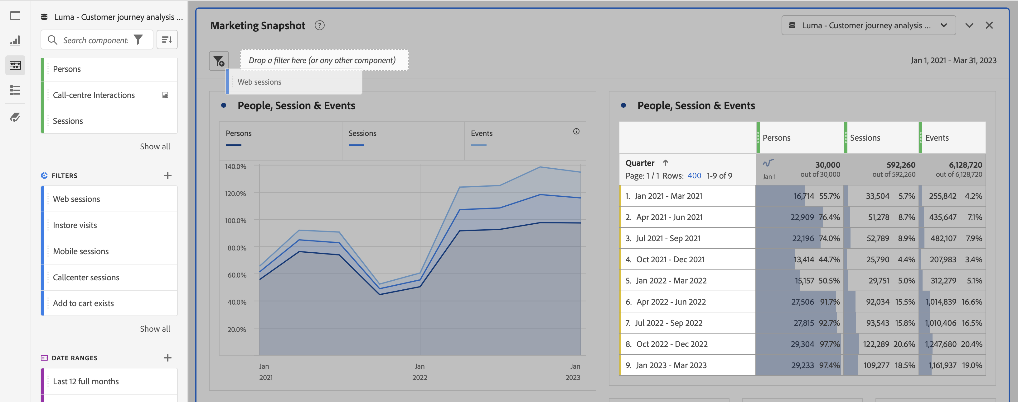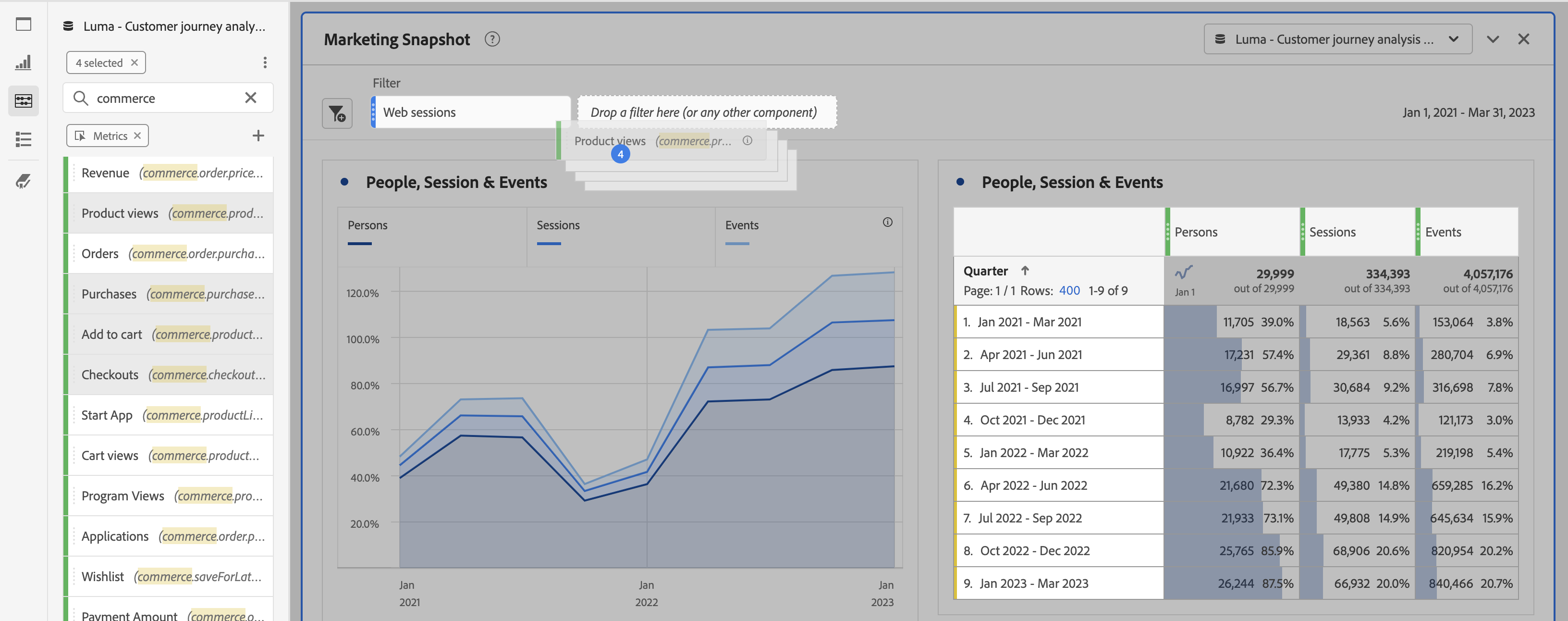 Arraste e solte os segmentos do painel à esquerda na área de destino do painel para começar a segmentá-lo. Repita esse processo para adicionar mais segmentos ao painel. Os segmentos aparecem lado a lado na parte superior do painel.