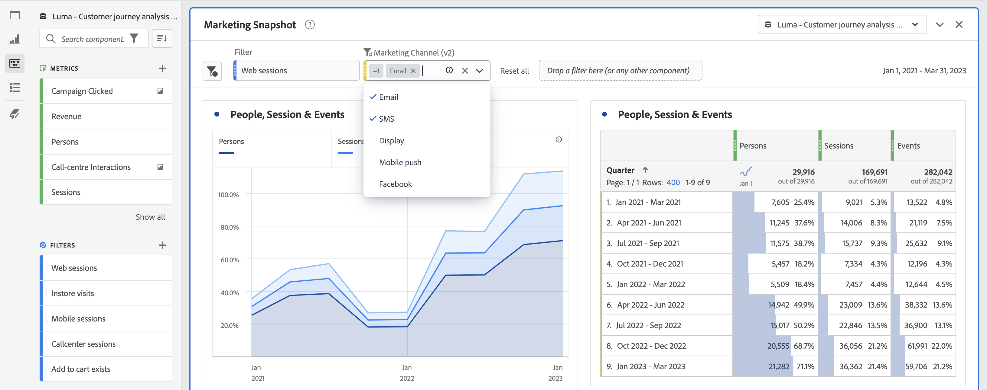 Aplicar vários segmentos ao painel selecionando mais de um segmento na lista de segmentos suspensos. O painel é segmentado para incluir qualquer um dos segmentos selecionados.