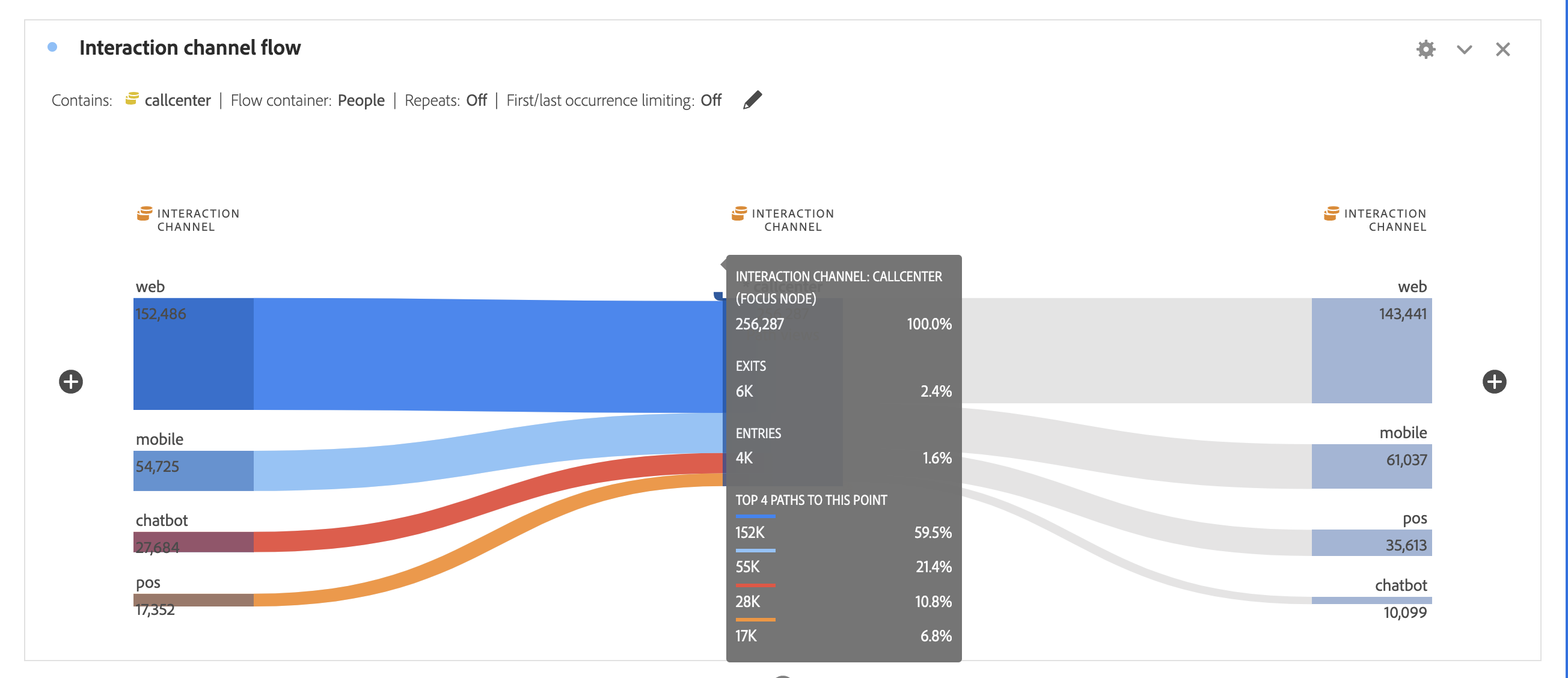 처음/마지막 발생으로 제한 차원, 항목 또는 지표의 처음 또는 마지막 발생으로 진입 또는 종료하는 경로로 경로를 제한합니다. 자세한 설명은 처음/마지막 발생으로 제한을 참조하십시오. 열 수 플로우 다이어그램에 원하는 열 수입니다. 최대 5개의 열을 지정할 수 있습니다. 열당 항목 확장됨 각 열에 원하는 항목 수입니다. 열당 확장된 최대 10개의 항목을 지정할 수 있습니다. 플로우 컨테이너 글로벌 계정 [B2B edition]{class="badge informative" title="Customer Journey Analytics B2B Edition"}, 계정 [B2B edition]{class="badge informative" title="Customer Journey Analytics B2B Edition"}, 기회 [B2B edition]{class="badge informative" title="Customer Journey Analytics B2B Edition"}, 구매 그룹 [B2B edition]{class="badge informative" title="Customer Journey Analytics B2B Edition"}, 세션 및 개인 간에 전환하여 경로 지정을 분석할 수 있습니다. 이러한 설정을 통해 세션 간 특정 컨테이너 수준에서 참여를 이해하거나 분석을 단일 세션으로 제한할 수 있습니다. note important IMPORTANT 열 수와 열당 확장된 항목의 조합에 따라 플로우 시각화를 만드는 데 필요한 기본 요청 수를 결정합니다. 열 수가 높을수록 시각화를 렌더링하는 데 시간이 오래 걸립니다. -