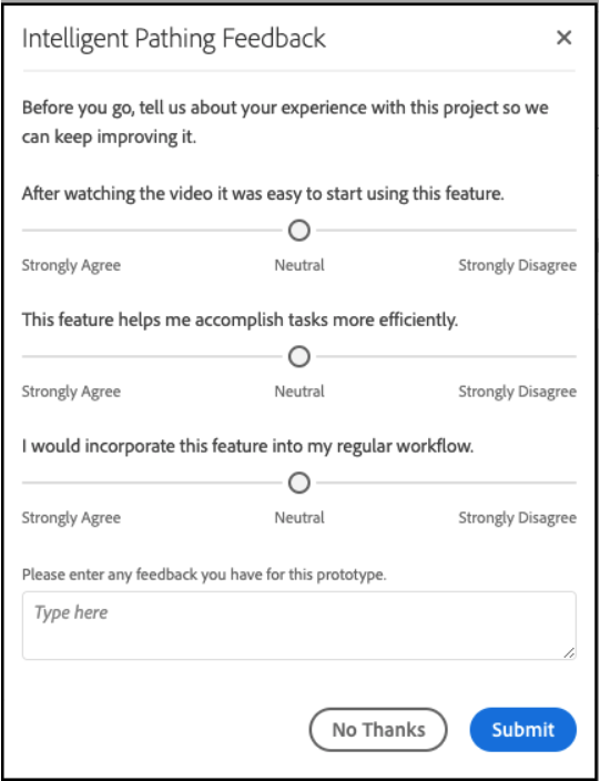 다른 프로토타입을 시도하거나 프로토타입 환경을 종료하려면 화면 오른쪽 상단에 있는 프로토타입 남기기를 클릭하고 프로토타입에 대한 간단한 설문 조사를 완료합니다. 프로토타입 프로젝트의 모든 변경 사항은 프로토타입 환경을 종료하면 없어집니다.