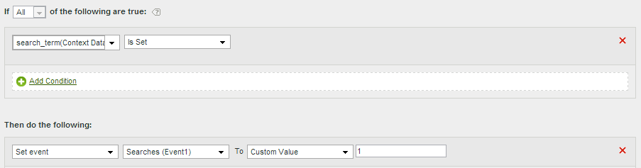 다음 규칙 정의는 컨텍스트 데이터 변수를 eVar 규칙에 복사에서 확장하여 특정 컨텍스트 데이터 변수를 포함하는 모든 히트에 대해서도 이벤트를 설정합니다.