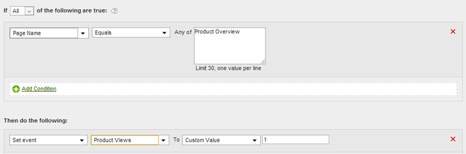 | Action | Définir l’événement Vues de produits d’événement sur la valeur personnalisée 1 |