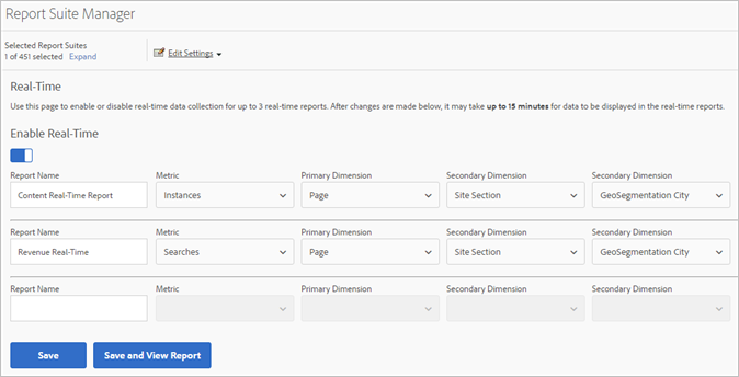 (Également disponible sous Analytics > Admin > Report Suites > Modifier les paramètres > Temps réel.)