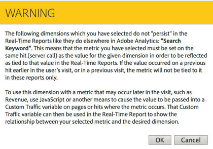 Certaines dimensions (telles que « Mot-clé de recherche » ou « Produit ») ne persistent pas dans le rapport Temps réel comme elles le font ailleurs dans Adobe Analytics. Lorsque vous sélectionnez une mesure non permanente, cet avertissement s’affiche :