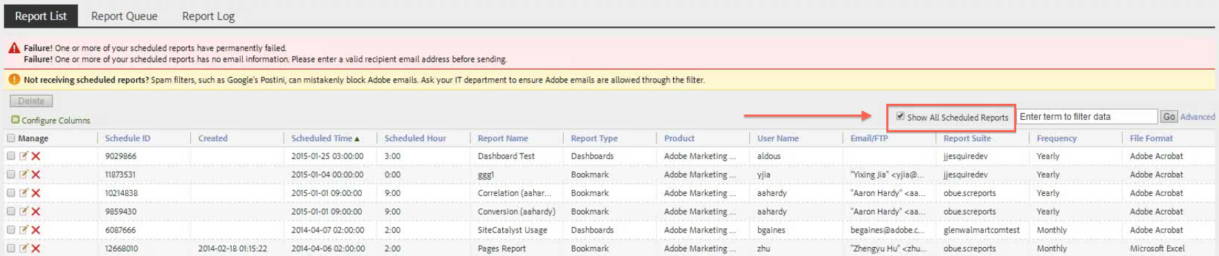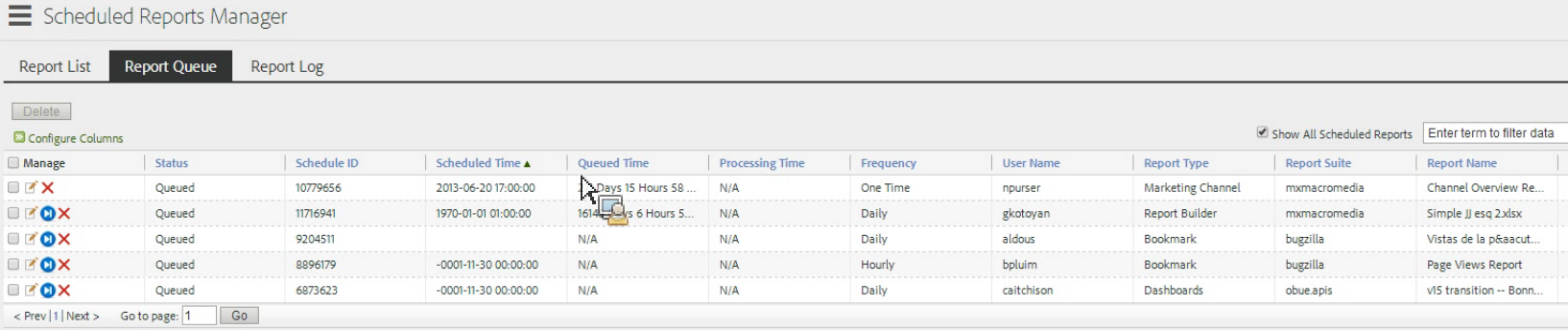 L’exposition de l’Identifiant de planification dans l’interface de file d’attente des rapports est utile lorsque vous devez contacter le service clientèle d’Adobe pour la résolution d’un problème de rapports planifiés.