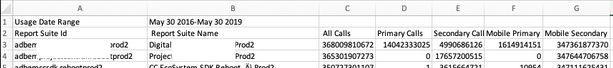 Voici une capture d’écran de ce à quoi ressemble le fichier .csv téléchargé. Il comprend une colonne pour l’identifiant de la suite de rapports. L’identifiant de la suite de rapports spécifie un ID unique pouvant uniquement contenir des caractères alphanumériques. Cet identifiant ne peut pas être modifié après la création d’une suite de rapports.