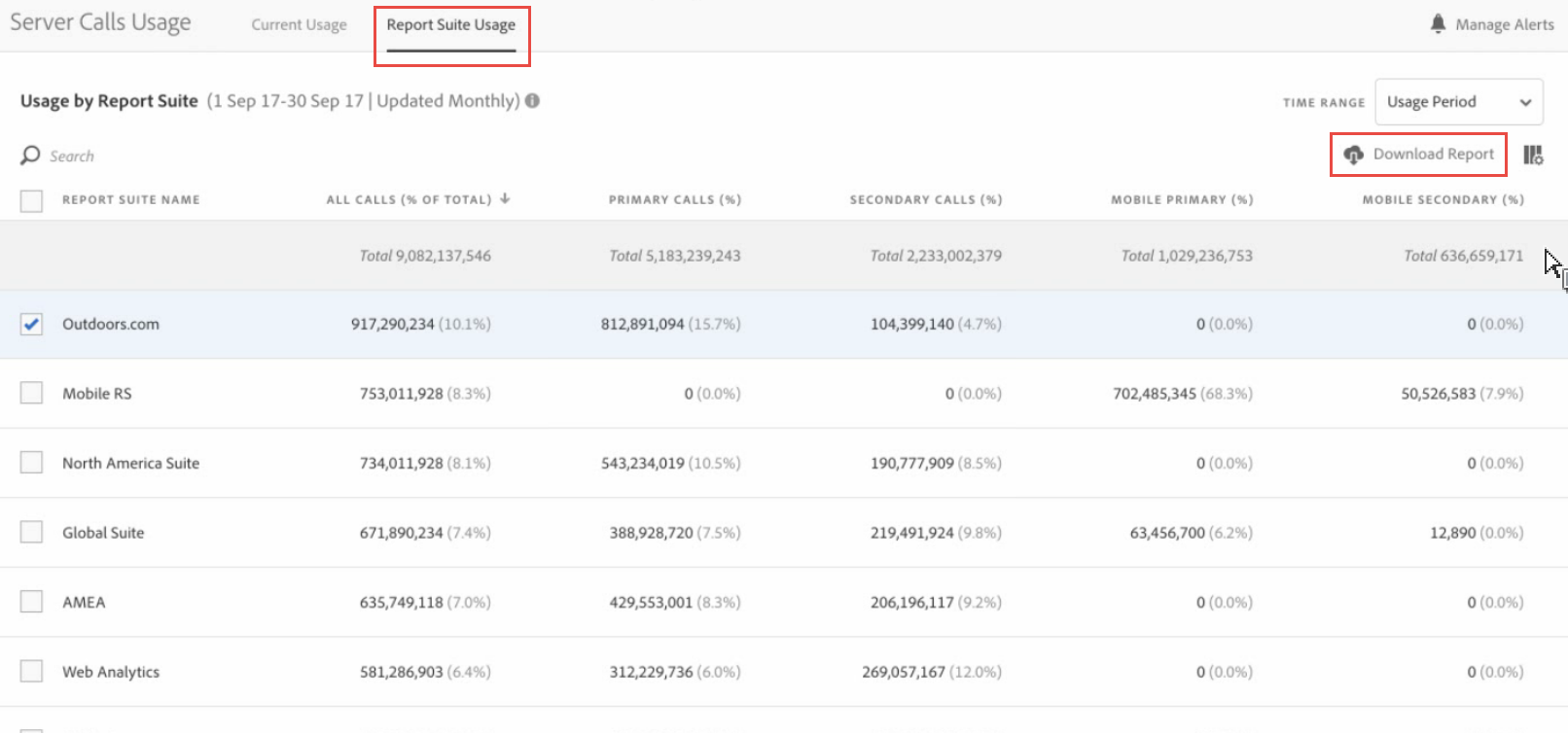 - affiche l’utilisation de l’appel au serveur de la période d’utilisation actuelle (tous les appels, principal, secondaire, principal mobile, secondaire mobile) pour chaque suite de rapports de votre organisation Experience Cloud ;
