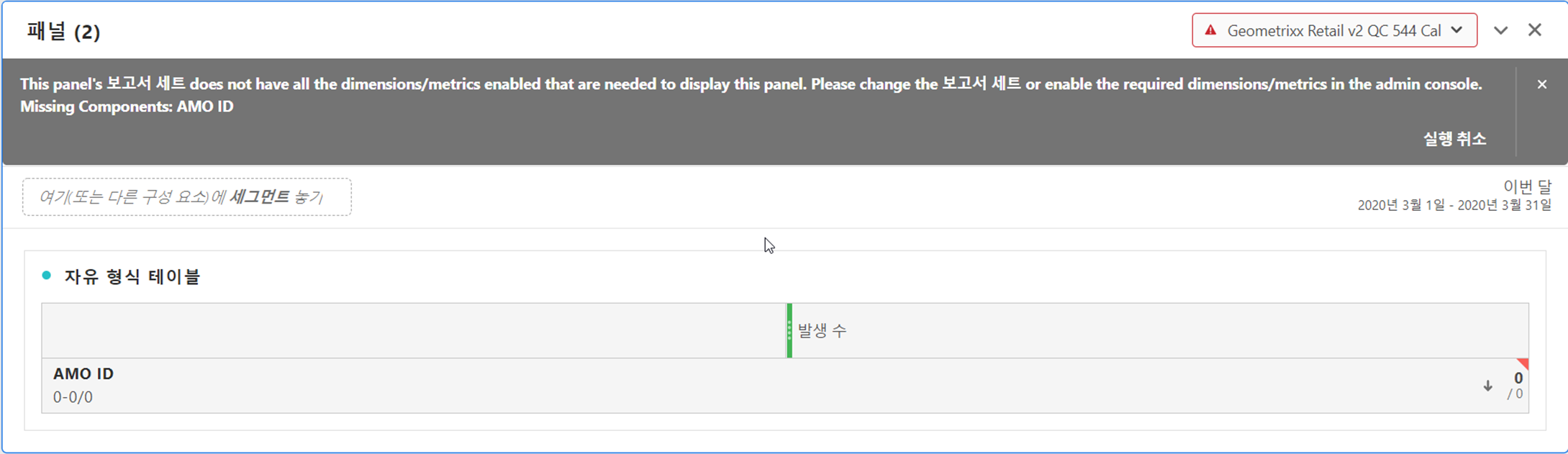 프로젝트에 포함된 구성 요소의 일부만이 보고서 세트에 포함된 경우 프로젝트를 로드할 때 (또는 보고서 세트로 전환할 때) 배너가 표시되는 경우가 있습니다. 누락된 구성 요소가 나열됩니다. 다음 지침에 따라 필요한 지표/차원으로 권한을 설정합니다.