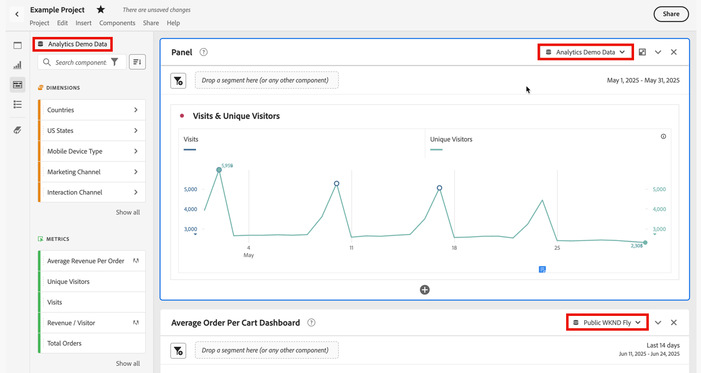 이제 Analysis Workspace에서 두 개 이상의 보고서 세트의 데이터를 사용하여 프로젝트를 만들 수 있습니다. 보고서 세트는 이제 패널 수준에서 선택되므로 동일한 작업 영역 프로젝트 내에서 각 패널에 대해 다른 보고서 세트를 선택할 수 있습니다.