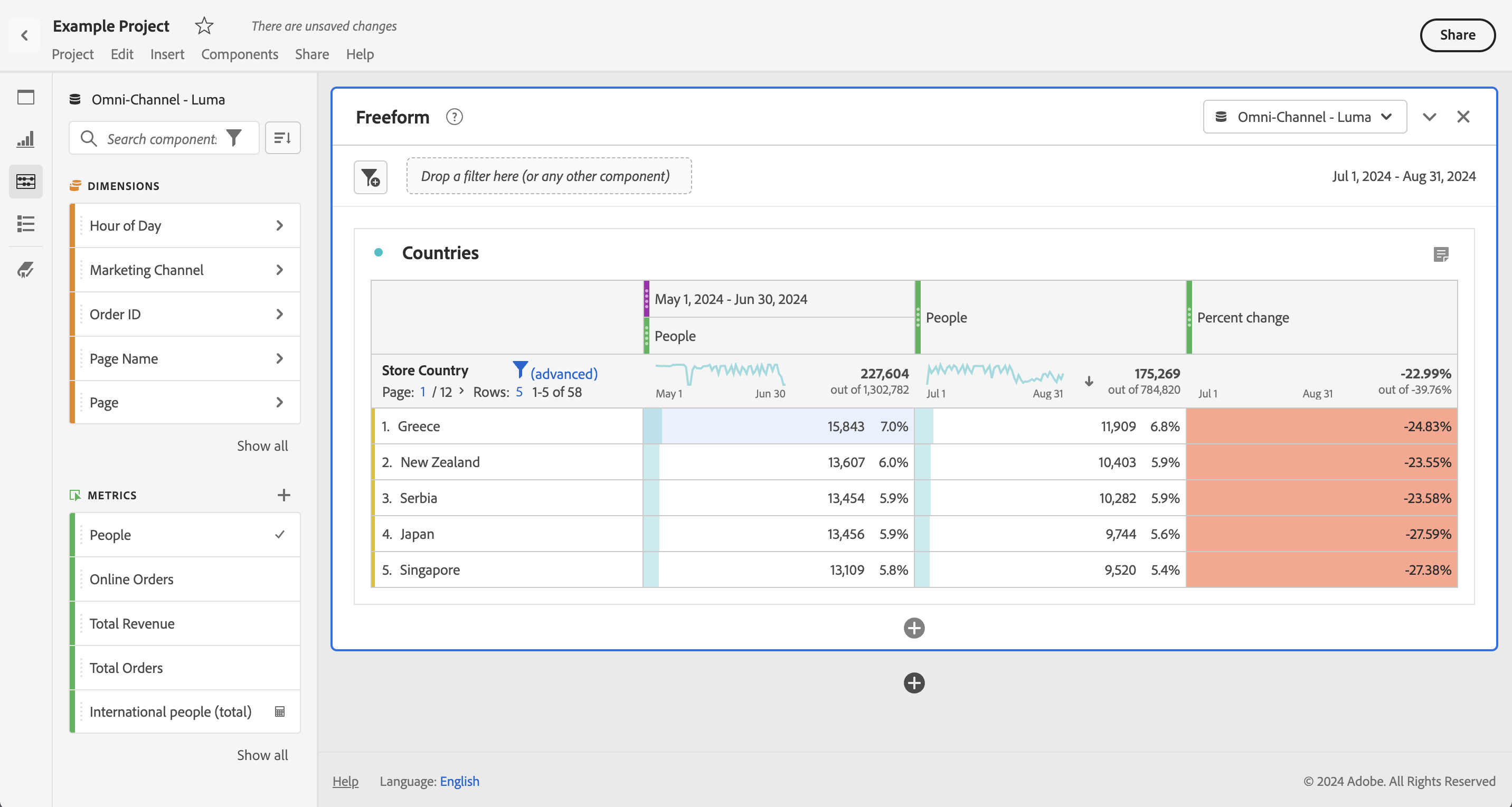 분석하려면 컨텍스트가 필요하며, 해당 컨텍스트를 이전 기간에서 제공하는 경우가 종종 있습니다. 예를 들어 "작년 이맘때보다 얼마나 좋아질까요/나빠질까요?"라는 질문은 비즈니스를 이해하는 데 기본적인 질문입니다. 날짜 비교에 "차이점" 열이 자동으로 포함되는데, 이 열은 지정된 기간과 비교한 백분율 변경을 표시합니다.