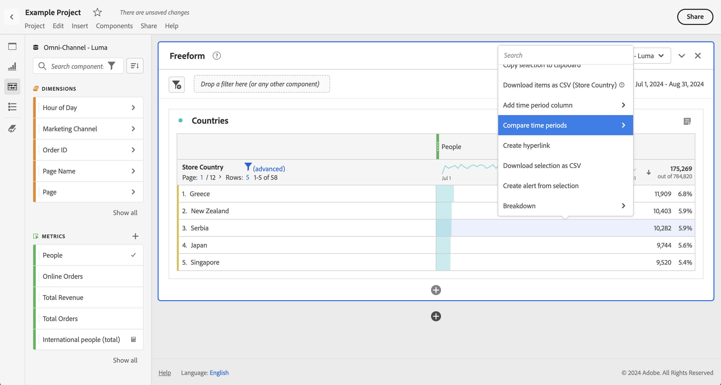 기간 비교는 고급 계산된 지표를 활용합니다. 따라서 Analytics Select, Prime 및 Ultimate SKU가 있는 고객만 사용할 수 있습니다.