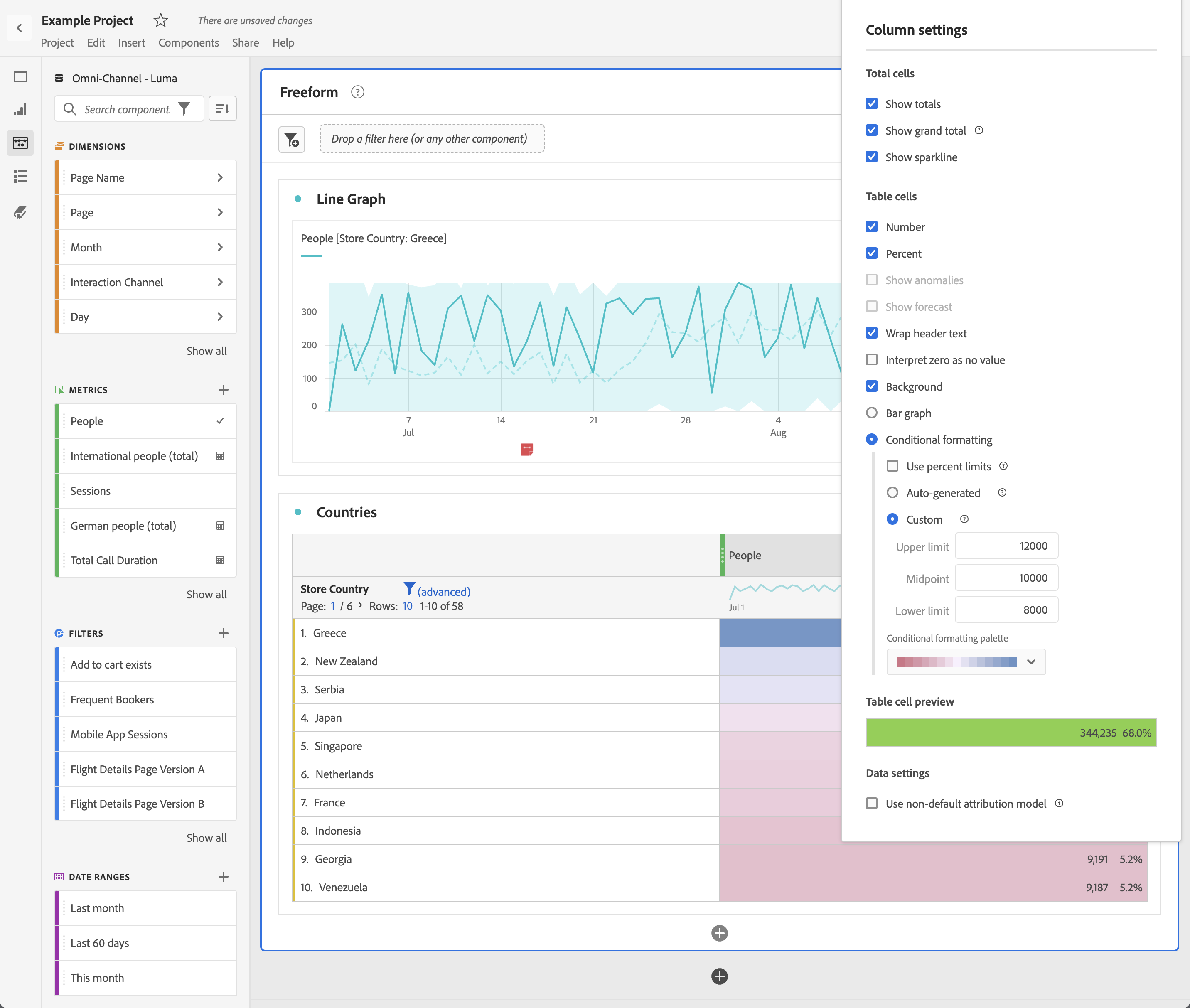 | Personnalisé | Vous pouvez affecter manuellement les valeurs des champs Limite supérieure, Milieu et Limite inférieure pour la mise en forme conditionnelle. Vous disposez ainsi de la flexibilité nécessaire pour déterminer si la valeur d’une colonne devient bonne, moyenne ou mauvaise. |